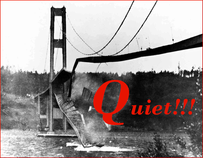 At this point the open book was flapping and fluttering with so much force that the very pages began to tear away from their binding and the volume itself began to disintegrate! Evidently, a runaway train of harmonic motion was transpiring before my very eyes — like in that old Technicolor video of the Tacoma Narrows bridge (a.k.a., “Gallopin’ Gertie”) as it rolls back and forth, accumulating momentum, until its very superstructure shatters and the bridge collapses. I realized that the amount of energy that my introverted colleague was transferring into the volume of Quiet was about to reach a potentially-lethal tipping point, so I cut my losses and bolted for the exit. I scarcely escaped the room when there was an ear-shattering and earth-shaking explosion; a blast of dust and detritus blew out from the doorway in a horizontal mushroom cloud formation.